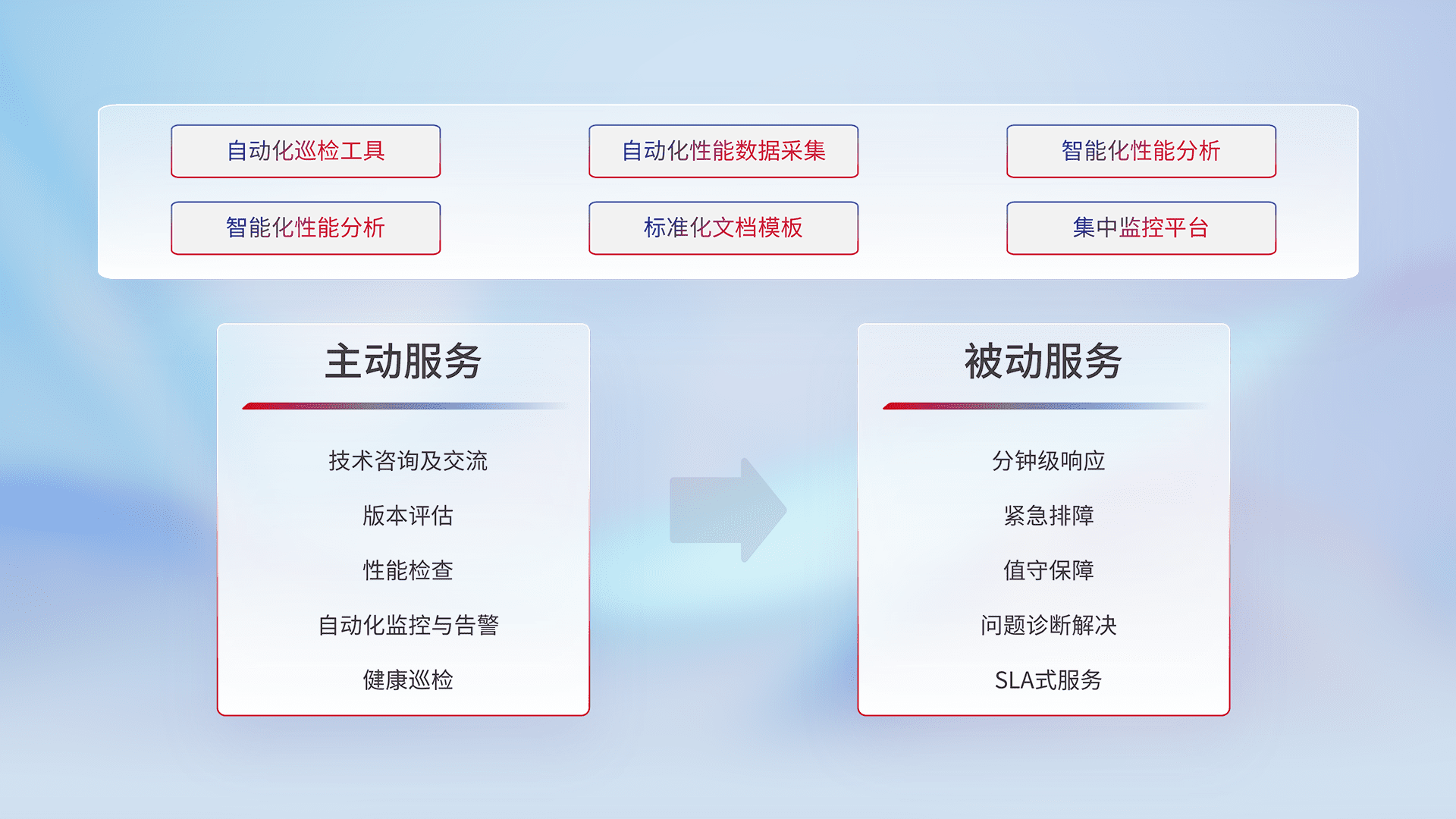 智能化工具和标准化文档,,,保障服务质量,,,,提供主动服务(包含技术咨询、、、版本评估、、性能检查、、自动化监控与告警、、、健康巡检)和被动服务包含(分钟级响应、、、、紧急排障、、值守保障、、、问题诊断解决、、、、SLA服务)。。。。